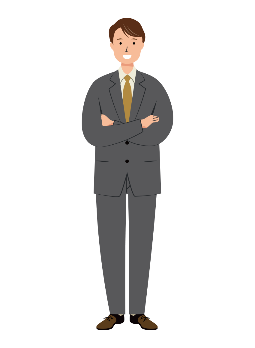 黒いスーツを着た、笑顔の表情で両腕を組んでいる男性会社員の全身イラストです。