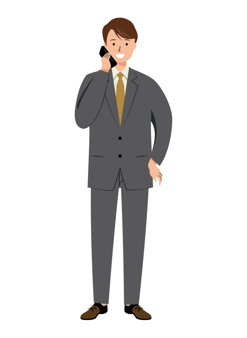黒いスーツを着た男性会社員が、笑顔でスマホを使い会話をしている全身イラストです。