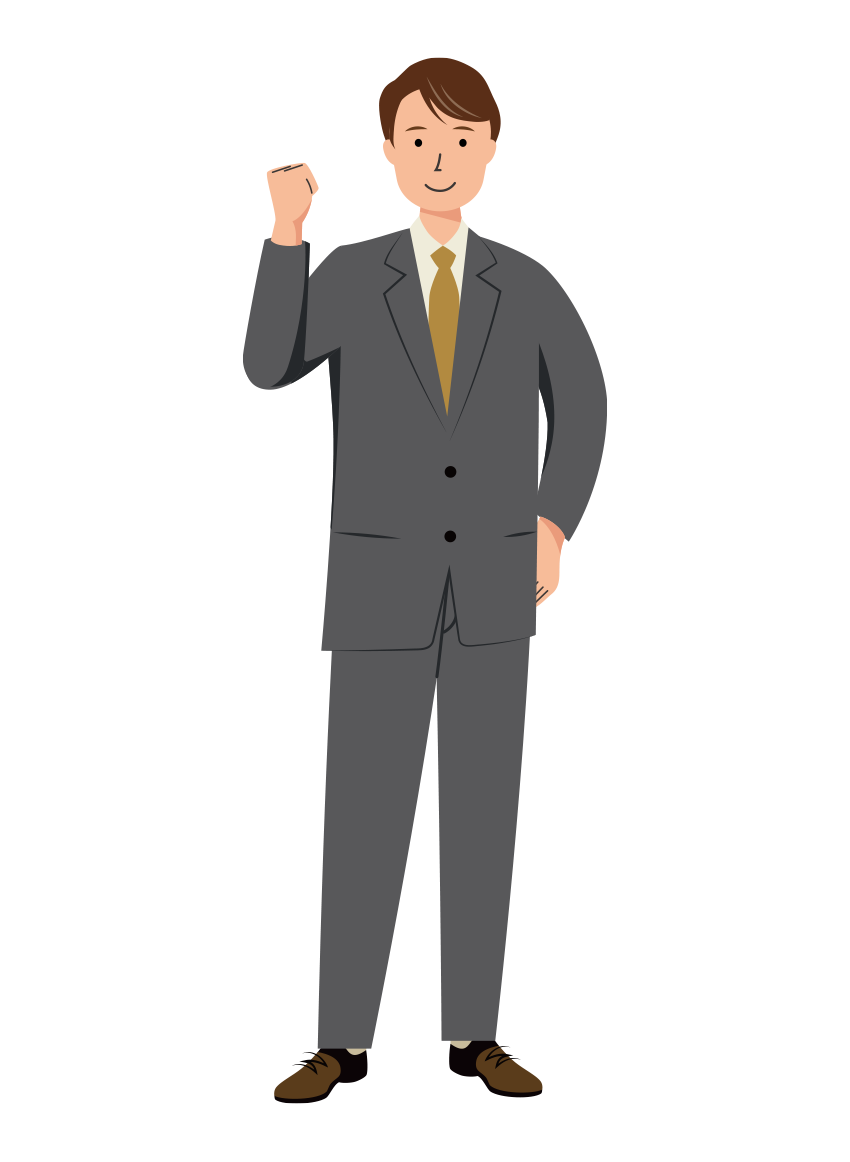 黒いスーツを着た男性会社員が、ガッツポーズをしている全身イラストです。