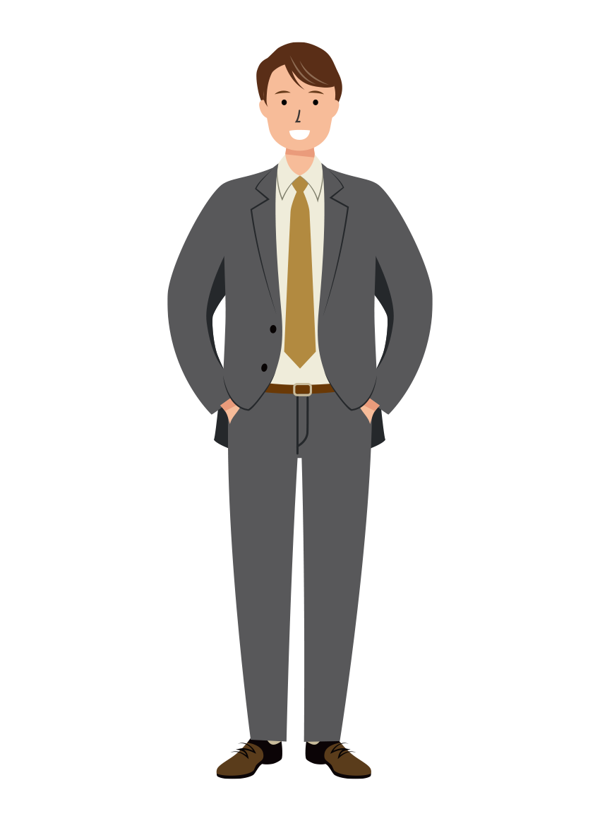 黒いスーツを着た男性会社員が、元気な姿でズボンのポケットに両手を入れている全身イラストです。