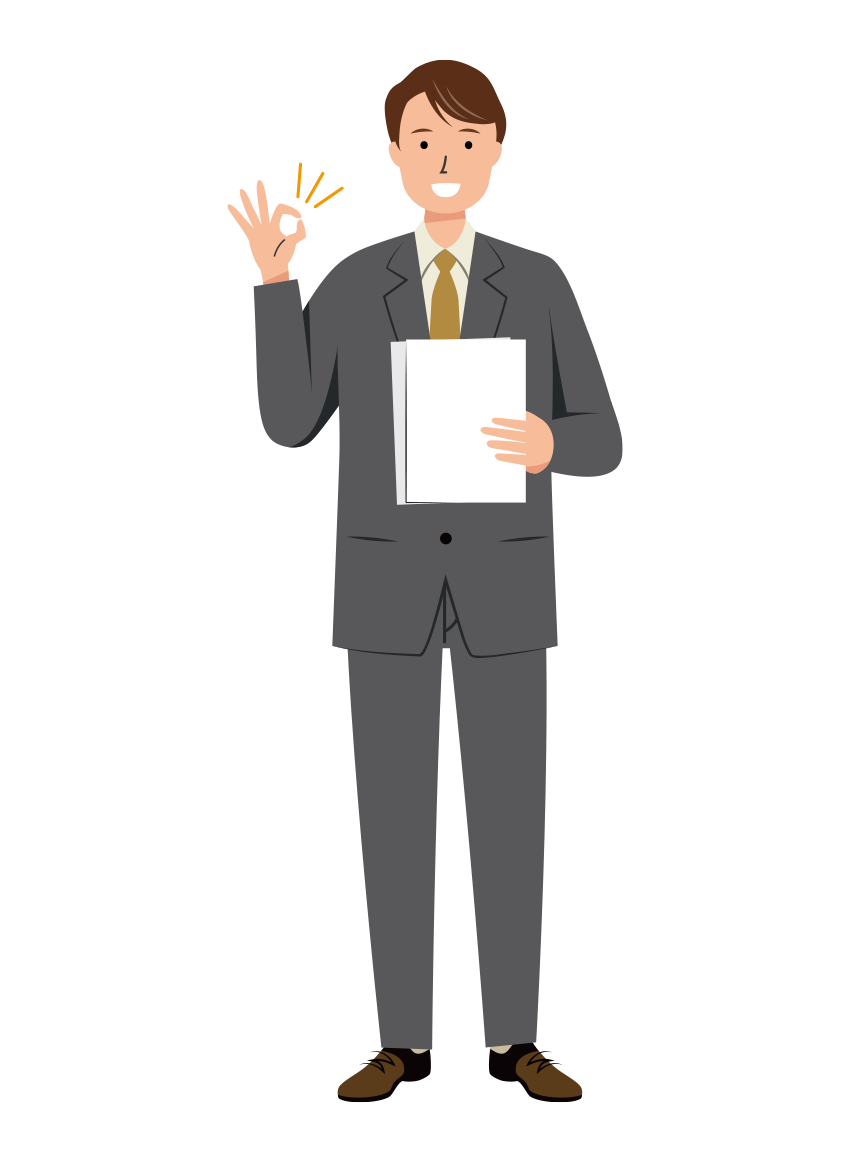 黒いスーツを着た男性会社員が、資料を持ち、笑顔の表情でOKサインを出している全身イラストです。