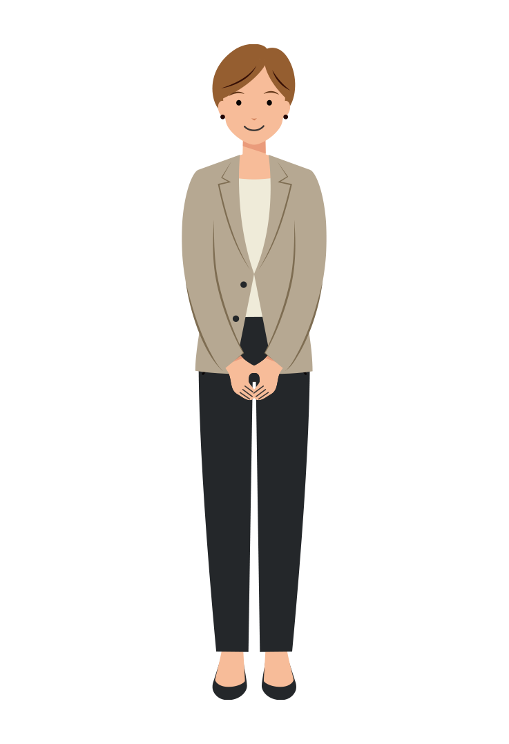 オフィスカジュアル姿のショートヘアの女性会社員が、両手を前に組んでいる全身イラストです。
