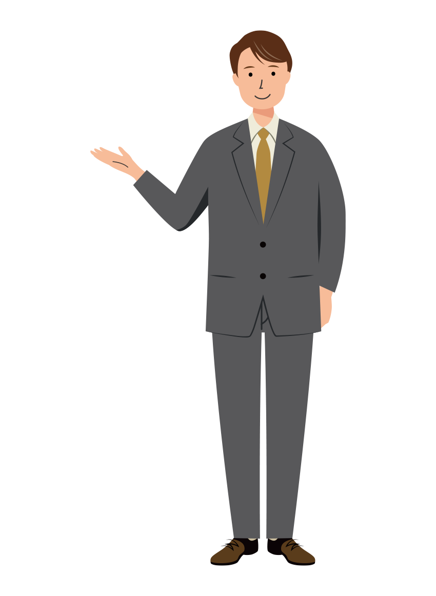 黒いスーツを着た男性会社員が、右手で案内をしている全身イラストです。