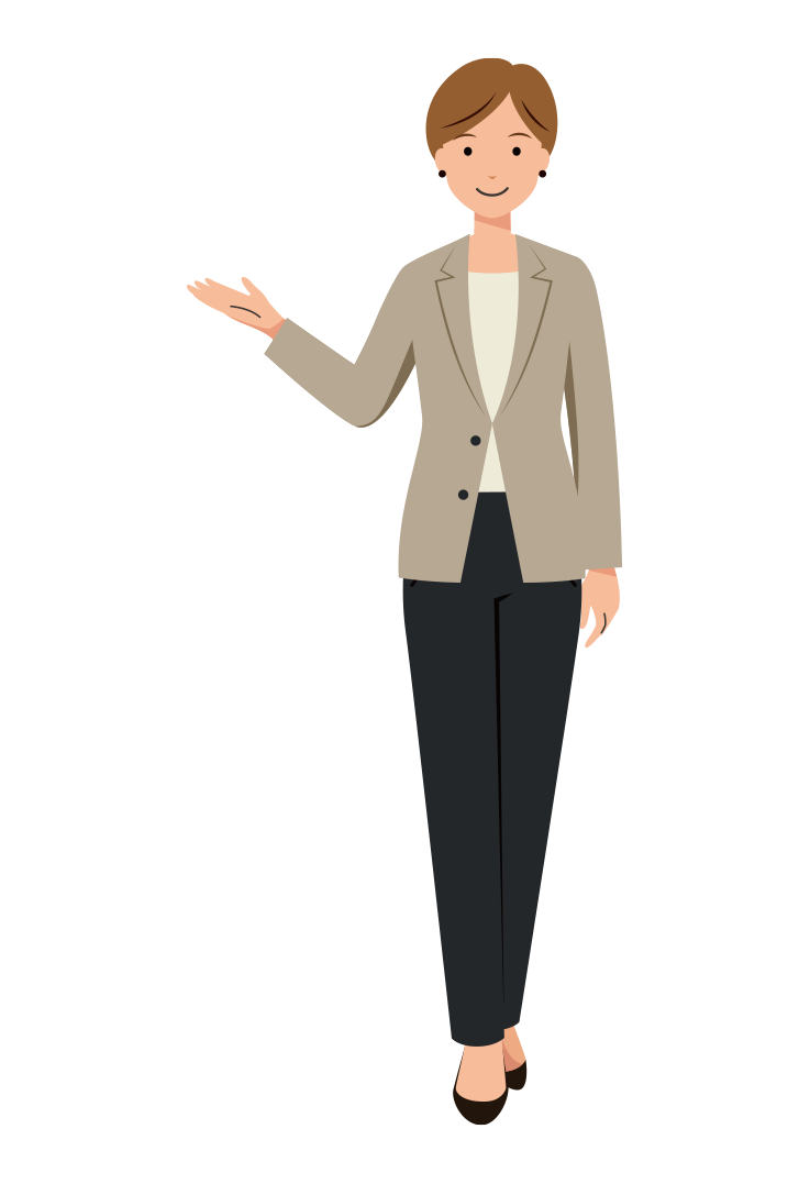 オフィスカジュアル姿のショートヘアの女性会社員が、右手で案内をしている全身イラストです。