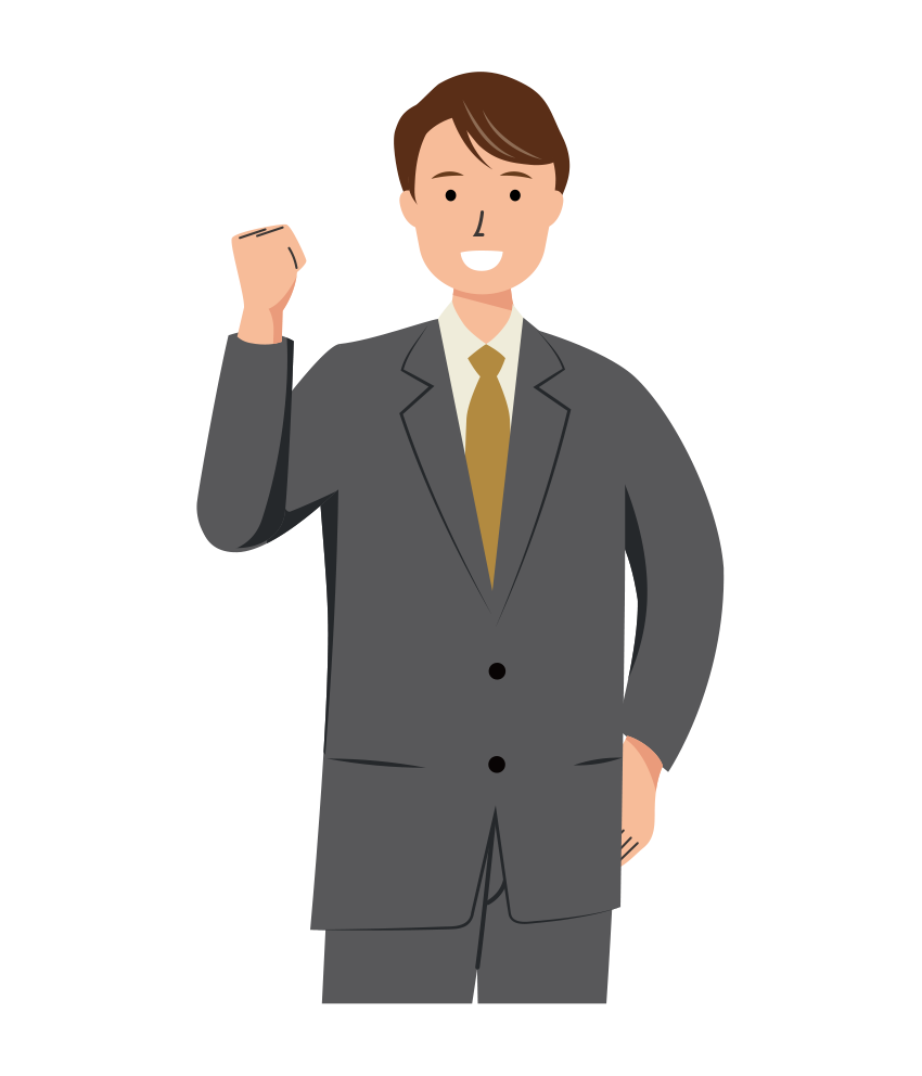 黒いスーツを着た男性会社員が、明るい笑顔でガッツポーズをしている上半身イラストです。
