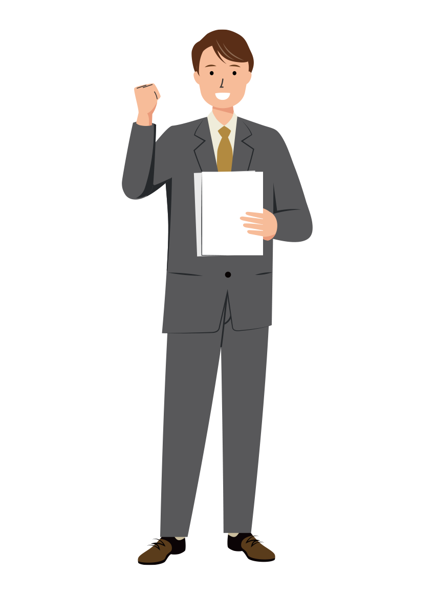 黒いスーツを着た男性会社員が、資料を片手に持ち笑顔でガッツポーズをしている全身イラストです。