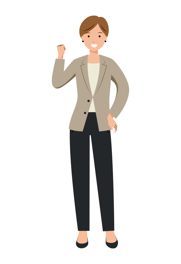 オフィスカジュアル姿のショートヘアの女性会社員が、笑顔でガッツポーズをしている全身イラストです。