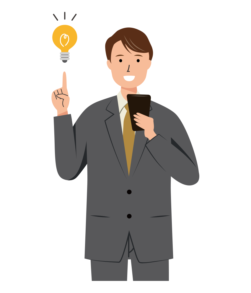 黒いスーツを着た男性会社員が、スマホを操作中に新しい発見に喜んでいる、ひらめいた瞬間の上半身イラストです。