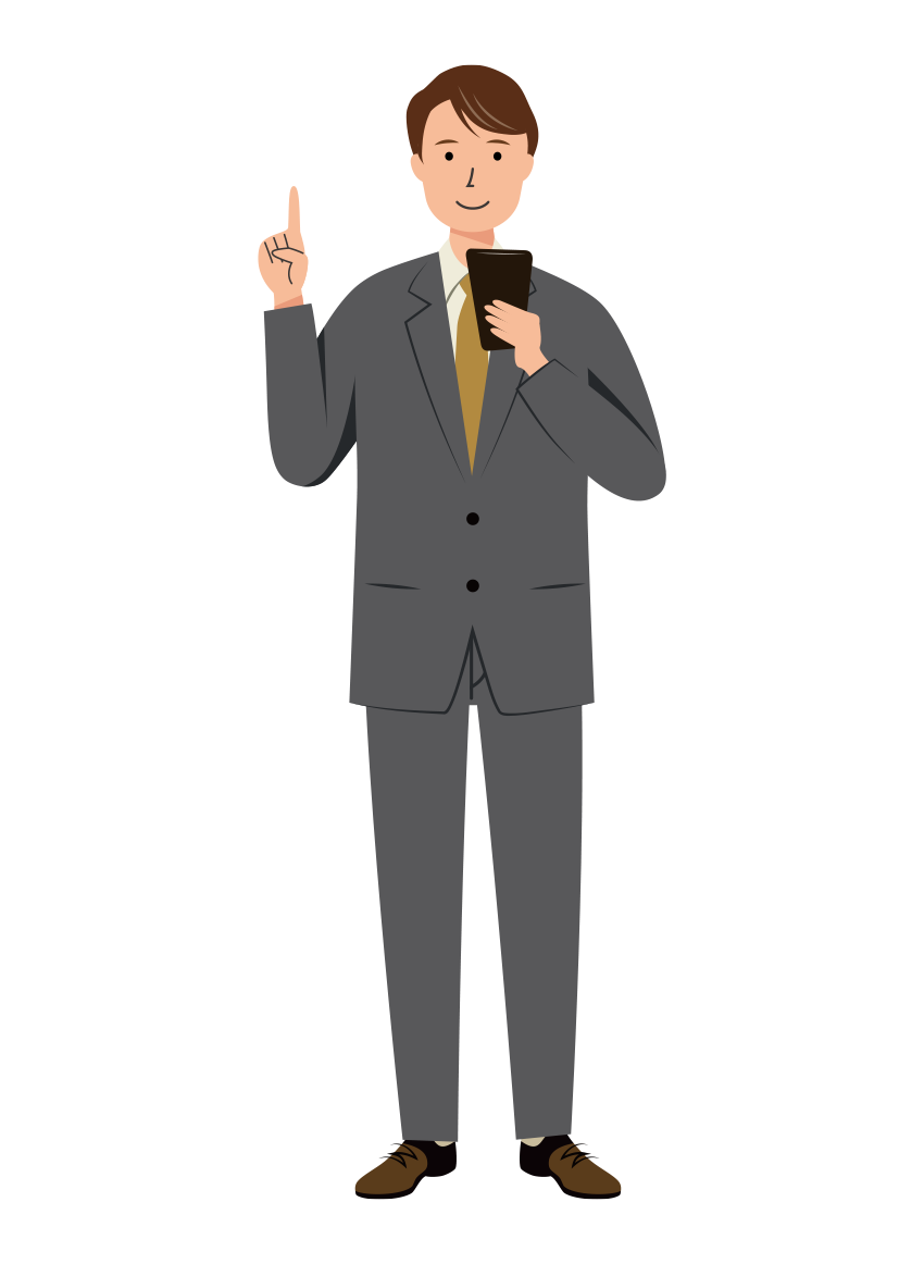 黒いスーツを着た男性会社員が、スマホを使い手続きの案内をしている全身イラストです。