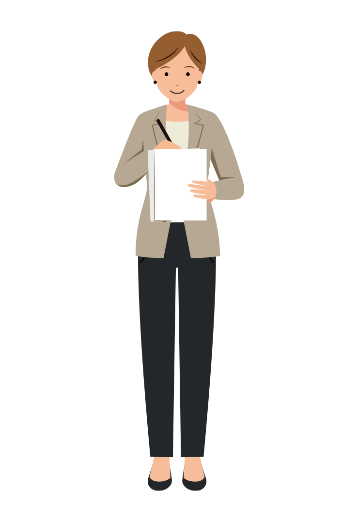 オフィスカジュアル姿のショートヘアの女性会社員が、業務のメモを取っている全身イラストです。