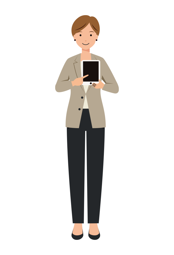 オフィスカジュアル姿のショートヘアの女性会社員が、業務用タブレットを使い説明している全身イラストです。