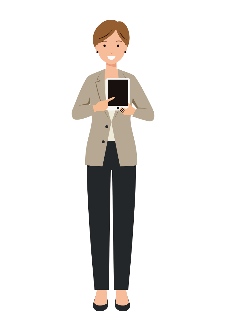オフィスカジュアル姿のショートヘアの女性会社員が、業務用タブレットを使い優しく説明している全身イラストです。