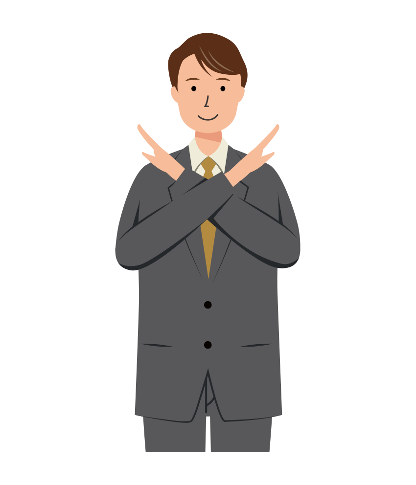 黒いスーツを着た男性会社員が、両手を使いNGサインを出している上半身イラストです。