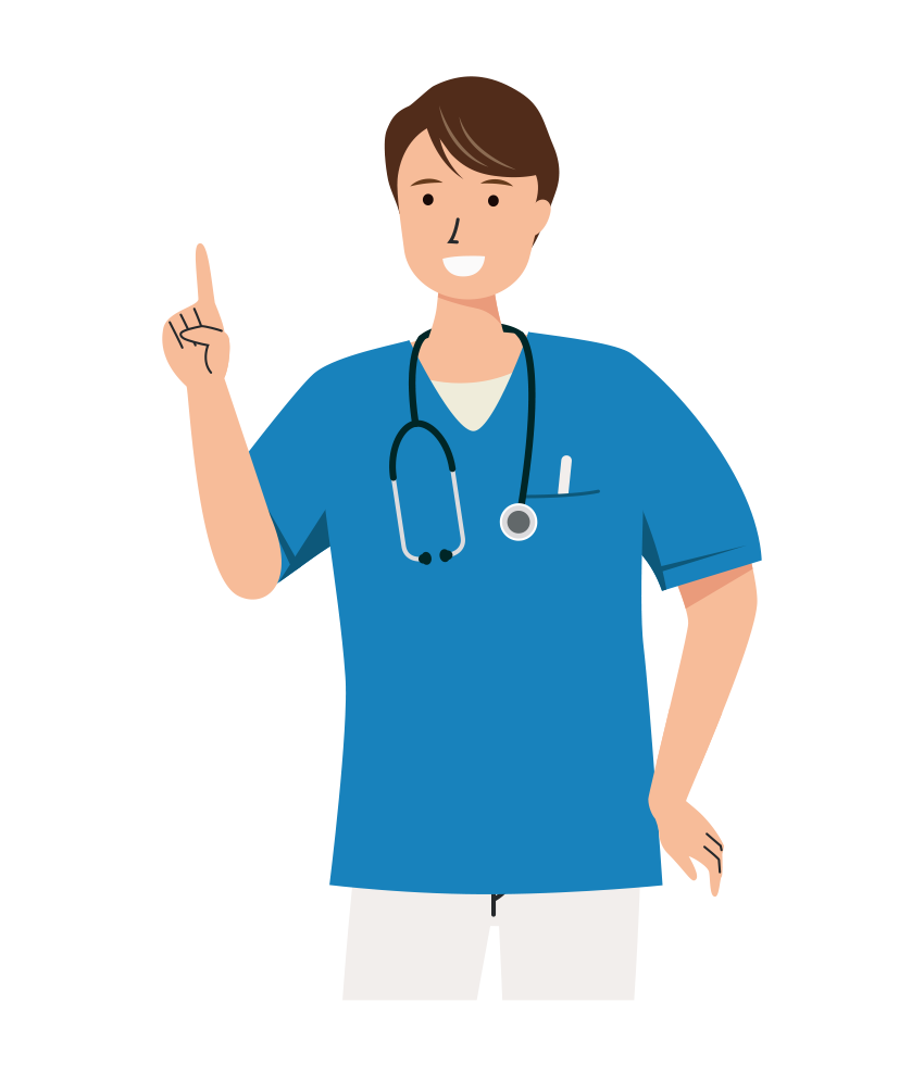 清潔感のある青いスクラブ服を着た男性看護師が、優しくアドバイスをしている上半身イラストです。