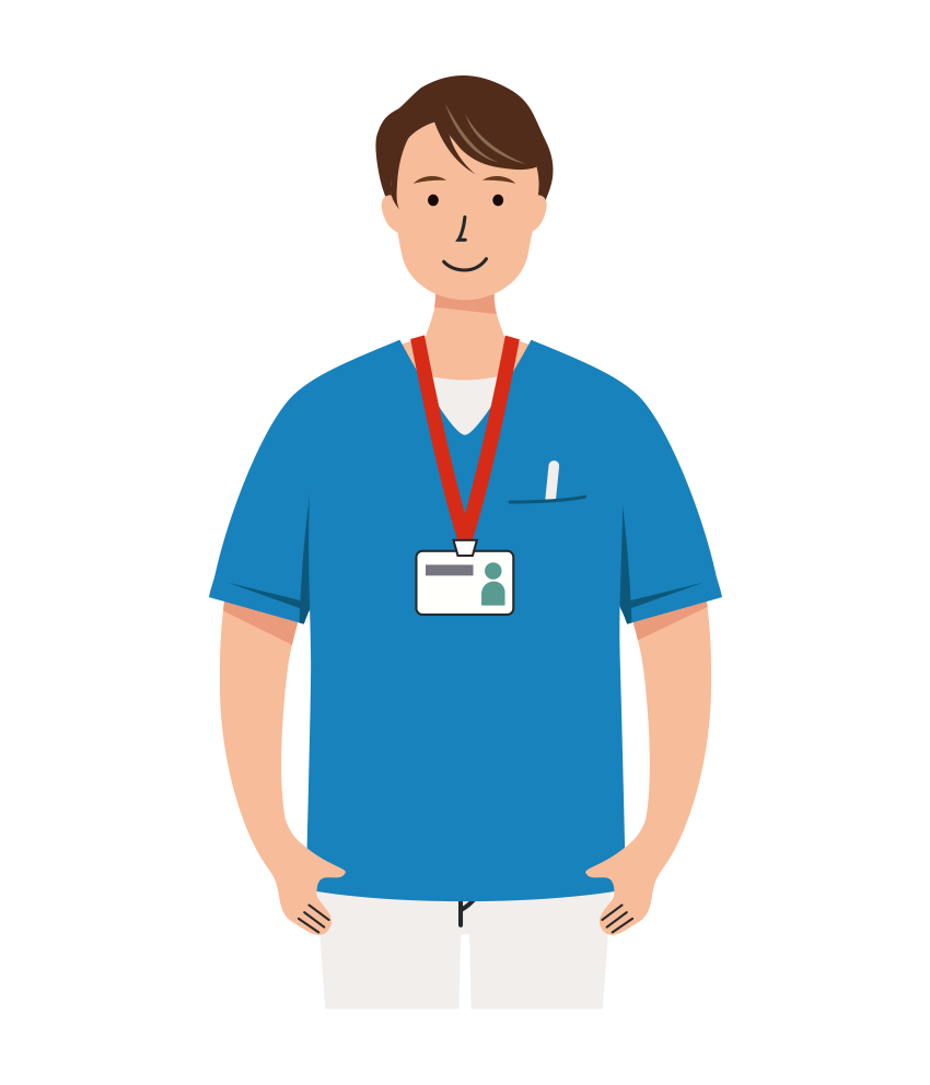 清潔感のある青いスクラブ服を着た男性看護師が、IDカードを首から下げている全身イラストです。