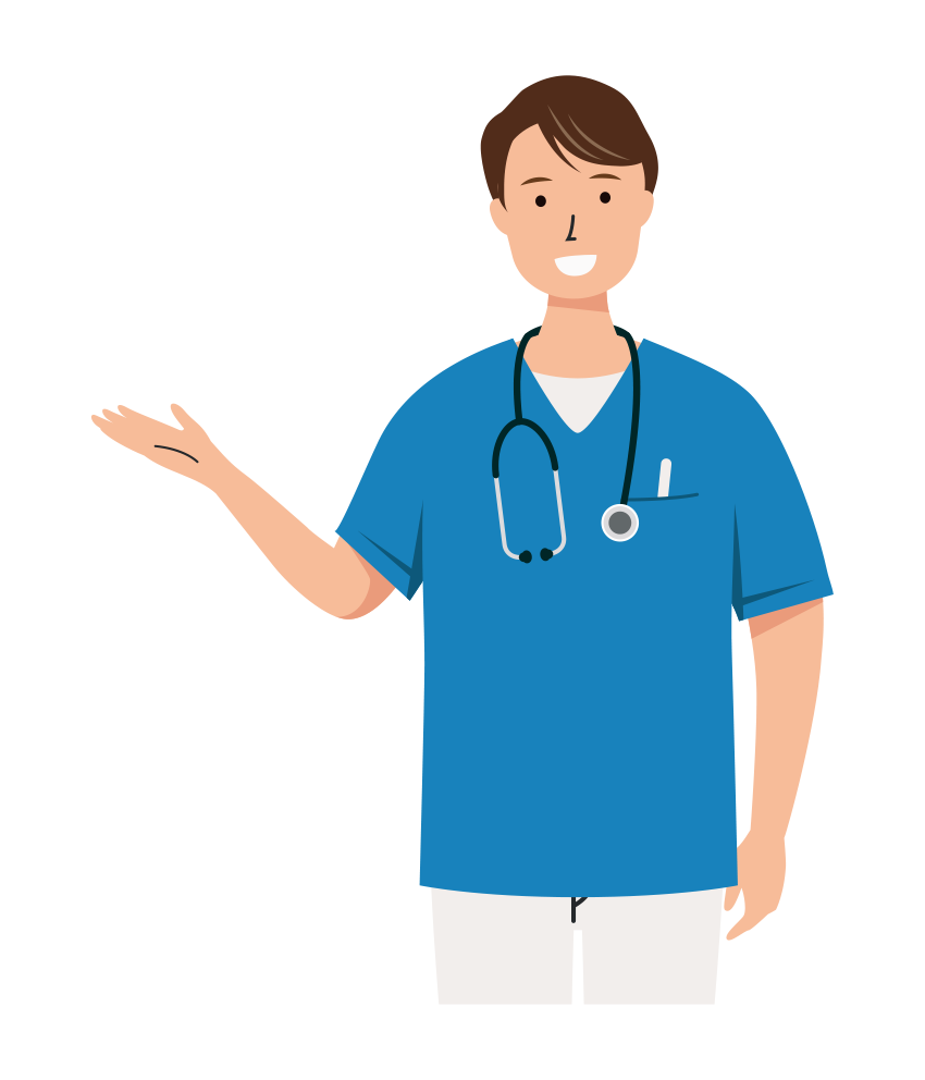清潔感のある青いスクラブ服を着た男性看護師が、明るい笑顔で案内をしている全身イラストです。