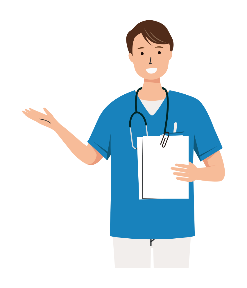 清潔感のある青いスクラブ服を着た男性看護師が、左手に資料を持ち笑顔で案内をしている上半身イラストです。