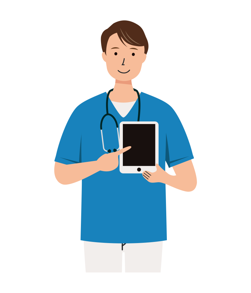 清潔感のある青いスクラブ服を着た男性看護師が、業務用タブレッドを使い、案内をしている上半身イラストです。