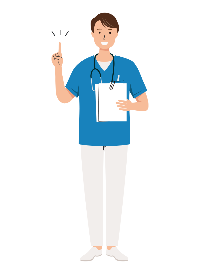 清潔感のある青いスクラブ服を着た男性看護師が、資料を片手に持ち優しい表情で説明している全身イラストです。