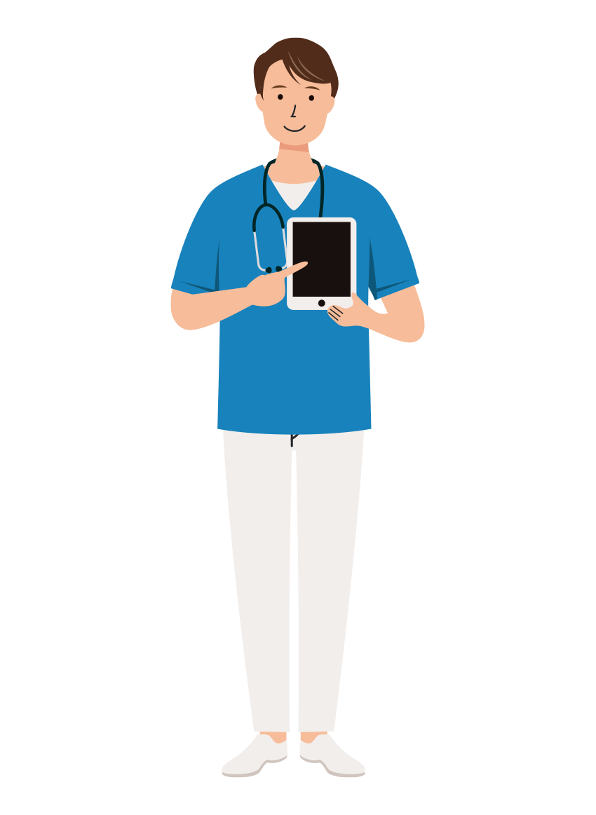 清潔感のある青いスクラブ服を着た男性看護師が、業務用タブレッドを使い、案内をしている全身イラストです。