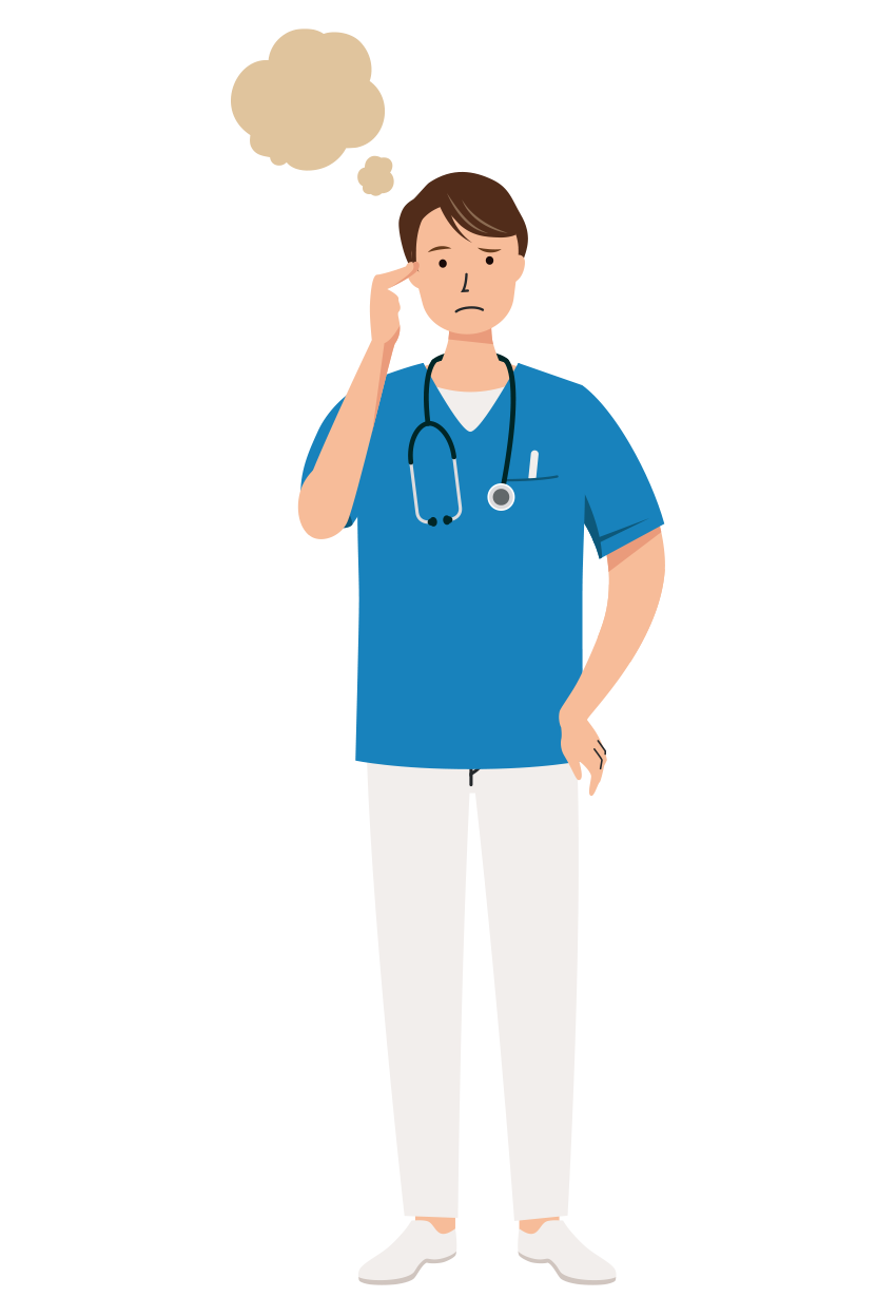 清潔感のある青いスクラブ服を着た男性看護師が、悩み考えている全身イラストです。