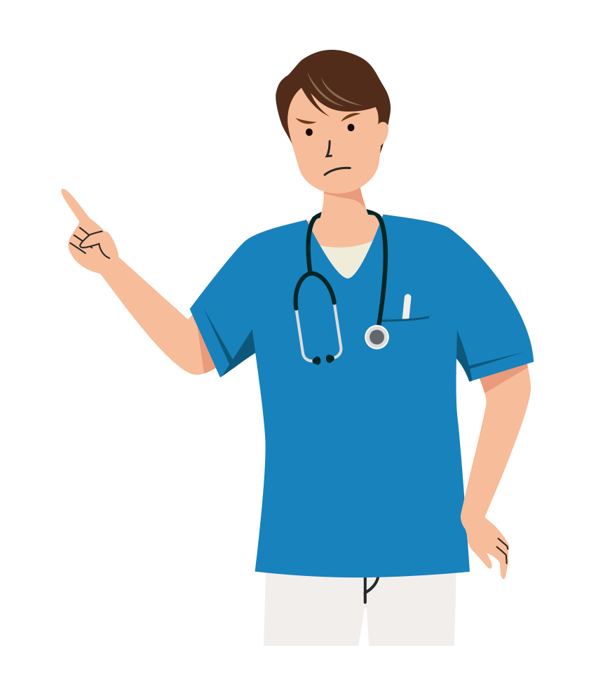 清潔感のある青いスクラブ服を着た男性看護師が、厳しい表情で指摘をしている上半身イラストです。