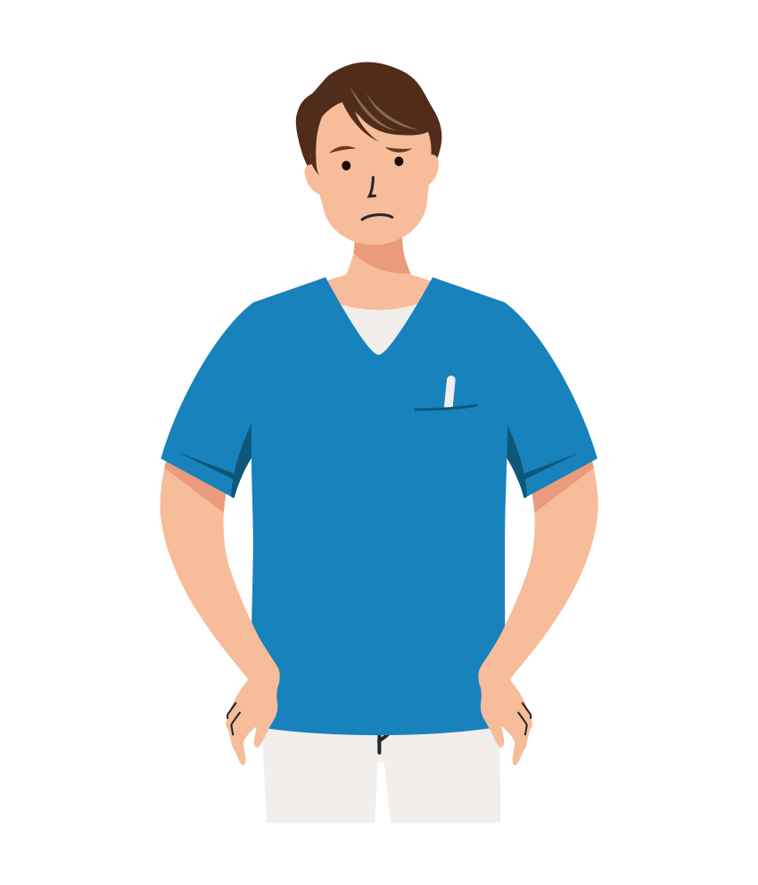 清潔感のある青いスクラブ服を着た男性看護師が、両手を腰に当て考え込んでいる上半身イラストです。
