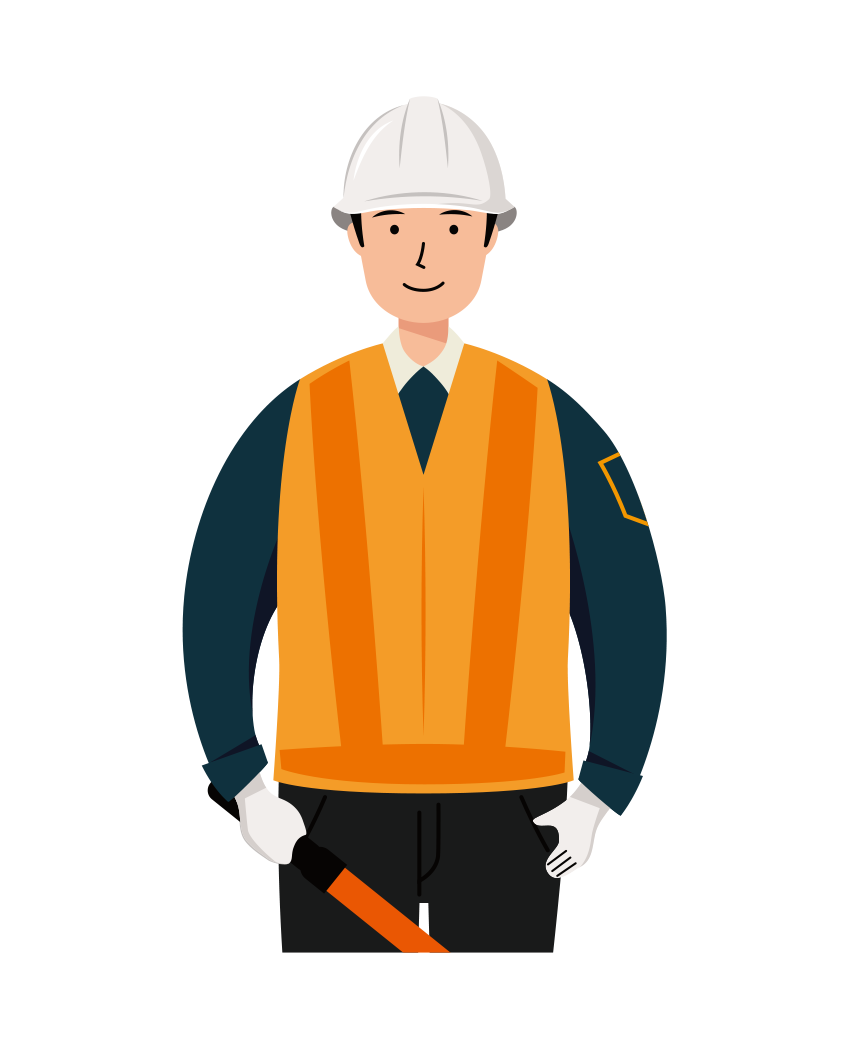 反射ベストを着た男性の交通誘導員が、右手に誘導棒を持ち待機している上半身イラストです。