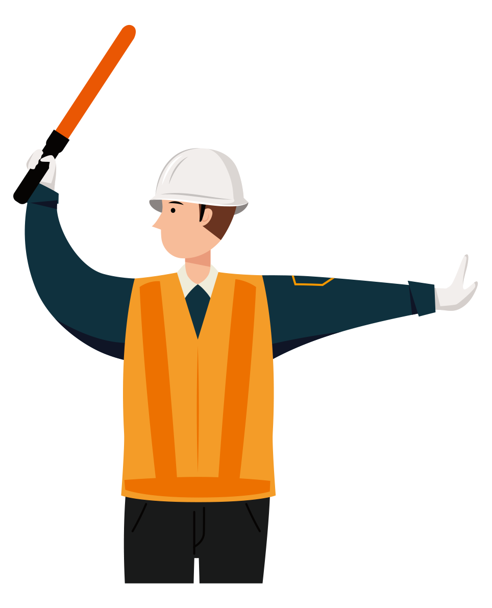 反射ベストを着た男性の交通誘導員が、右手に誘導棒を持ち、左手で停止の合図を出し交通整理をしている上半身イラストです。