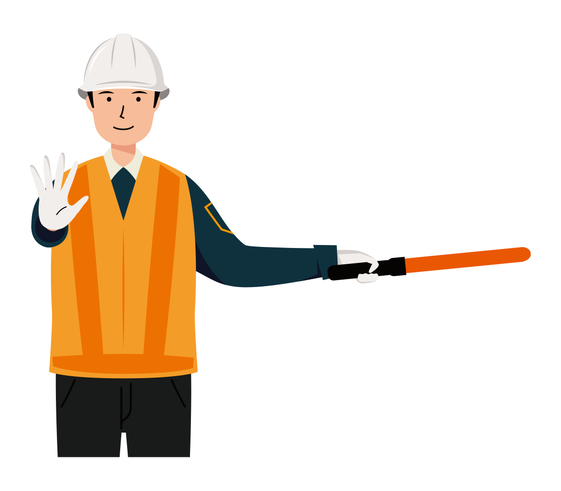 反射ベストを着た男性の交通誘導員が、誘導棒で停止合図をしている上半身イラストです。