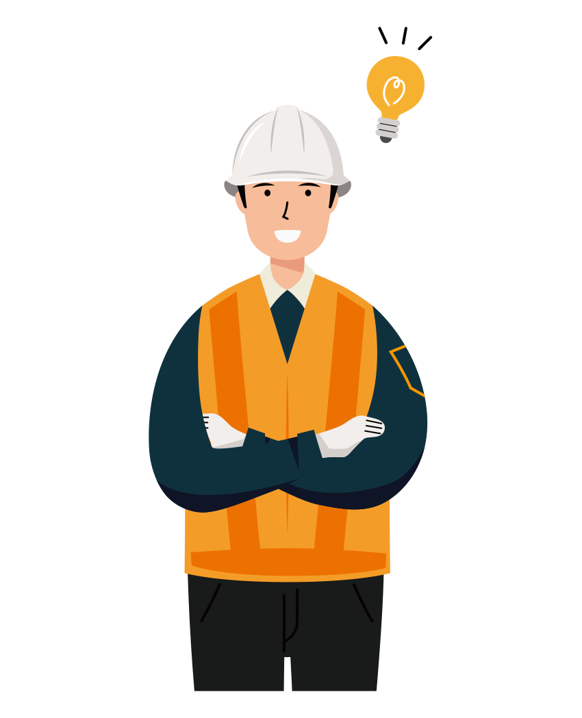 反射ベストを着た男性の交通誘導員が、新しい発想や取り組みにひらめいた瞬間の上半身イラストです。